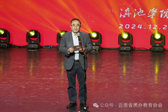 邹平会长在晚会上发表了热情洋溢的致辞。对大家的踊跃参与表示热烈欢迎,向晚会承办单位滇池学院和参加演出的昆明城市学院、昆明传媒学院表示感谢。指出即将过去的2024年,是共和国教育史上值得纪念的一年。全国、全省教育大会相继召开。全国教育大会清晰擘画了中国特色社会主义教育强国战略图景,系统部署了全面推进教育强国建设的战略任务和重大举措;全省教育大会提出举全力加快建设教育强省,以教育之强支撑和引领中国式现代化云南实践。全国、全省教育大会都对民办教育发展提出了新的要求和希望。这一年,全省民办教育系统深入学习贯彻习近平总书记关于教育的重要论述,深入实施教育高质量发展三年行动,在改善办学条件、规范办学行为、提高办学水平和质量等方面有了新的进步和突破。